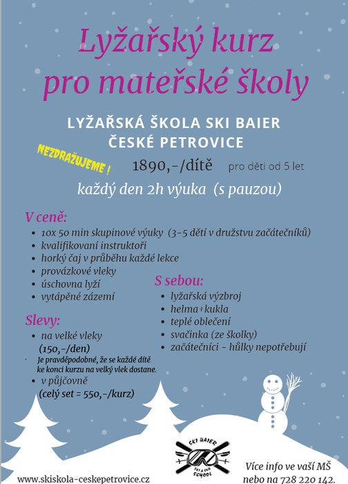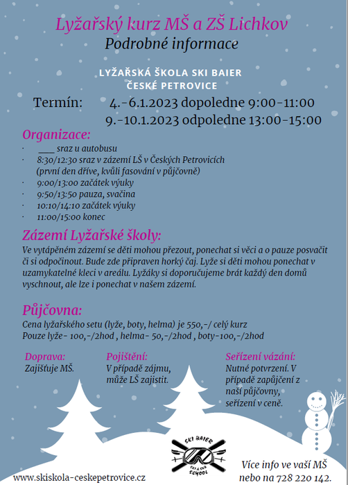 LYŽAŘSKÝ KURZ pro žáky ZŠ a předškoláky PŘESUNUT na 6. - 10. února 2023. - Potvrzeno bude později, opět podle sněhových podmínek a po domluvě s lyžařskou školou.