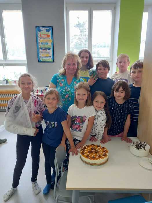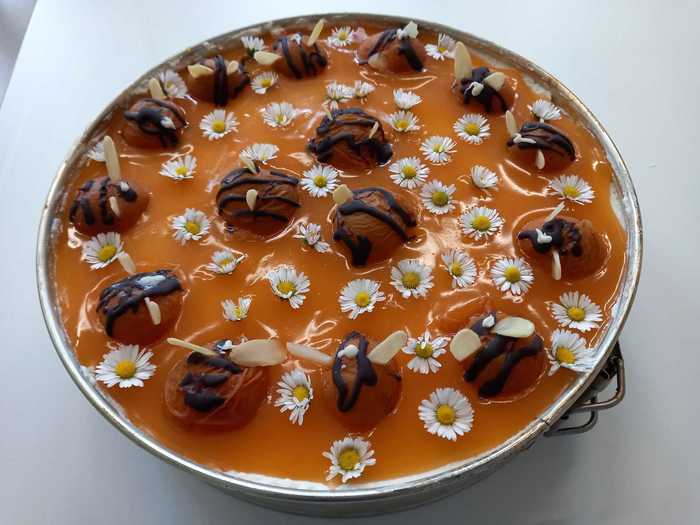 Vychladlý korpus potřeme tvarohovým krémem, ovocným pudinkem a ozdobíme " meruňkovými" včelkami a sedmikráskami.